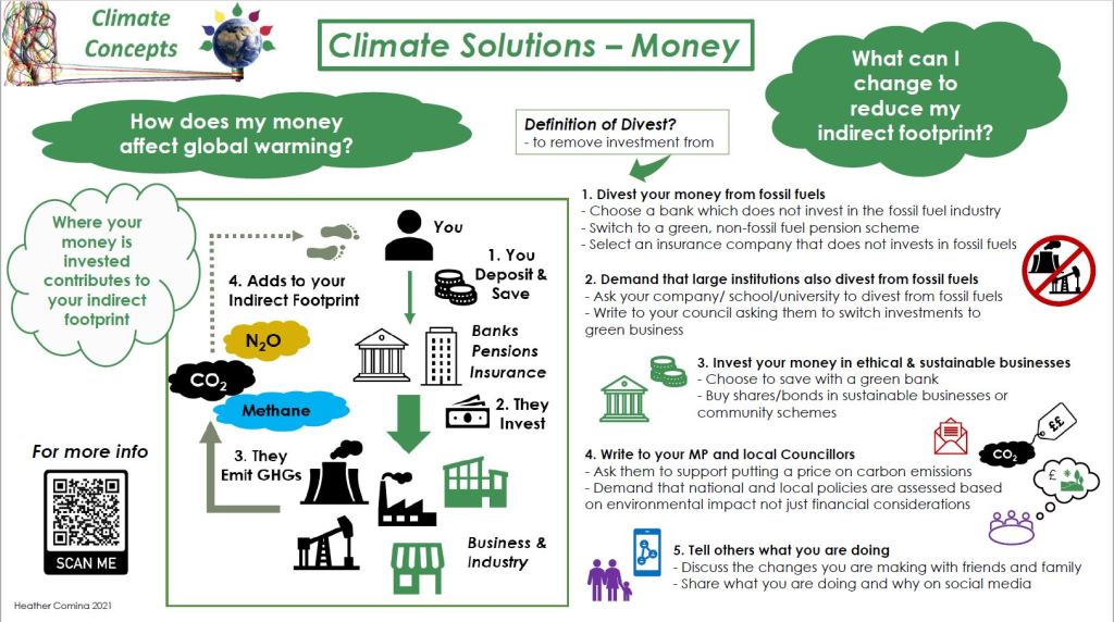 How money is invested has a fundamental impact on your indirect carbon footprint. There are several ways in which your money is invested in the wider system these include: Bank accounts, Pensions, Insurance, Shares in stocks and bonds.
