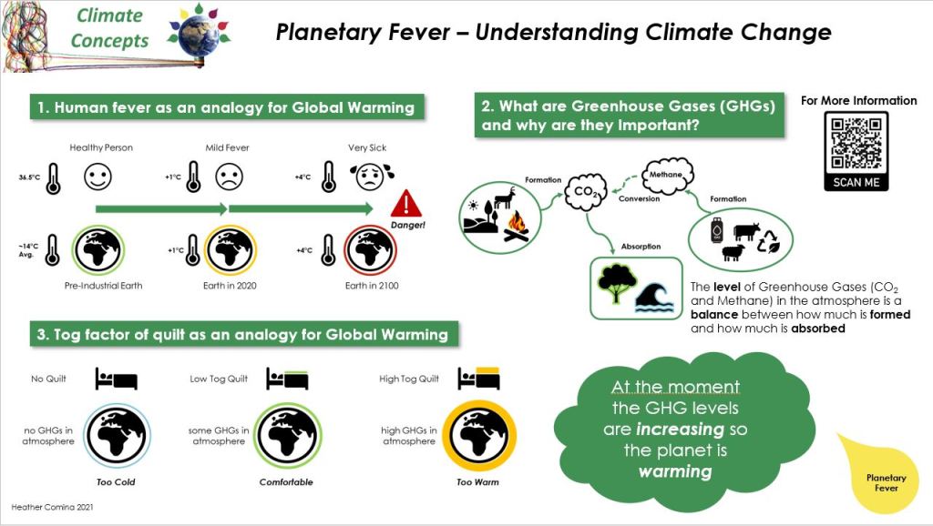 First in the series of concepts, Planetary Fever, introduces the concept of global warming in the context of a human fever and goes on to discuss green house gases and how they cause warming.