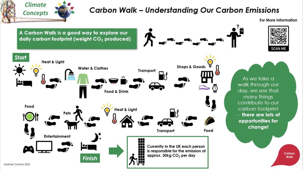 Having introduced the concepts of global warming, green house gases and the climate emergency the third concept in the series, the Carbon Walk, seeks to explore the level of our carbon emissions (using the UK as an example) and where they come from.